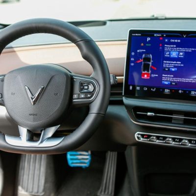 Vô-lăng 3 chấu được bọc da, thiết kế vô lăng của VF6 dạng vát đáy, trung tâm xe là màn hình kích thước lớn vừa để hiển thị thông tin vận hành.